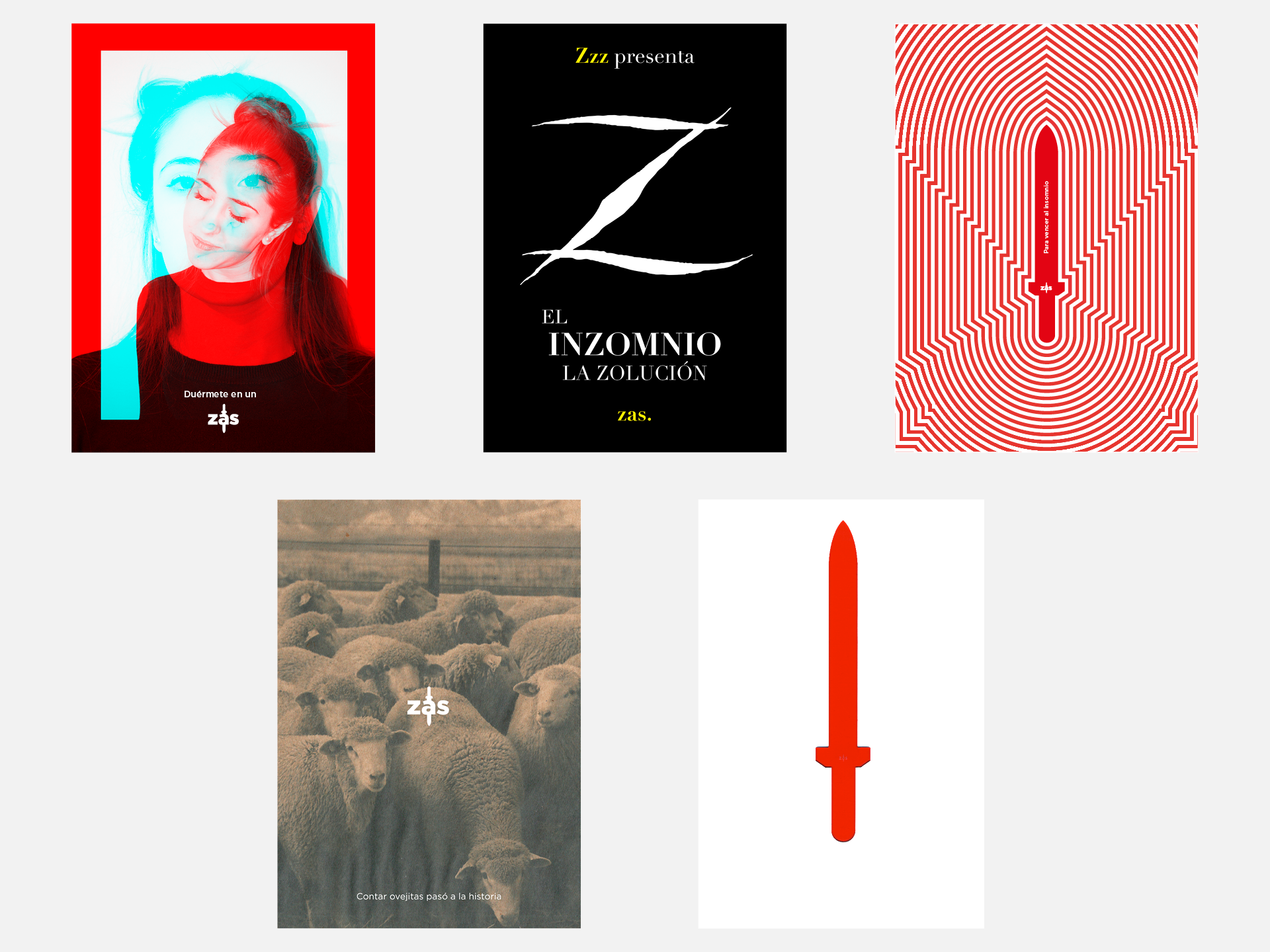 Art direction for Zas, a product self-created and named: a hypotetical sword that causes drowsiness immediately after it is drived into the brain. We had to communicate its wonderful effect through 5 different posters whose protagonists were the following graphic resources: colour, type, composition, image and form.